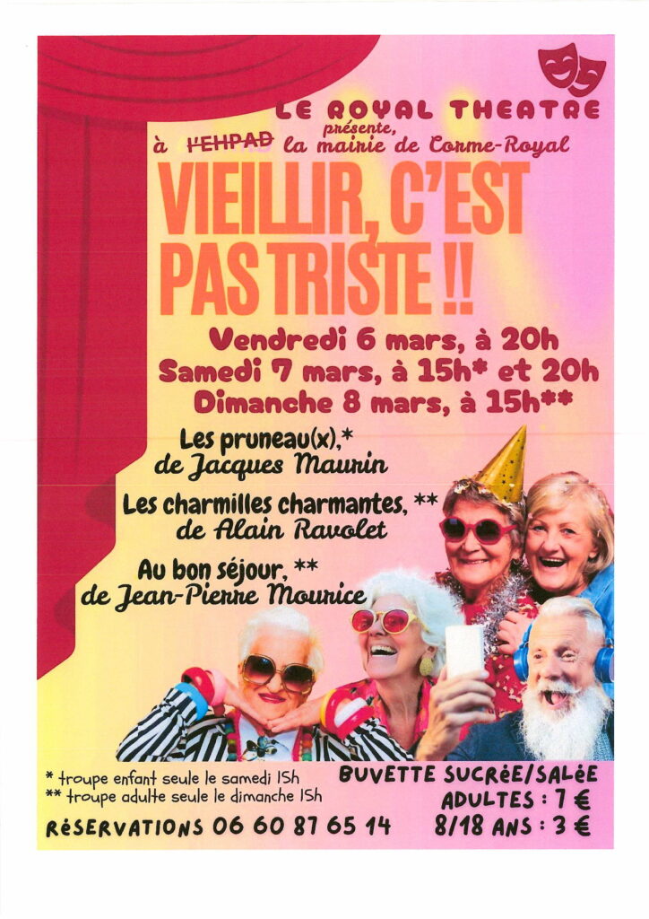 Représentations à la salle de la Mairie de Corme-Royal les vendredi 6 mars, samedi 7 mars et dimanche 8 mars 2026.