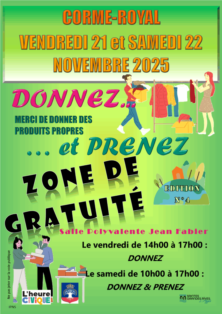 L’Heure Civique organise une « Zone de Gratuité » les vendredi 21 et samedi 22 novembre 2025 à Corme-Royal.